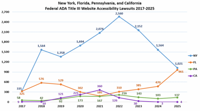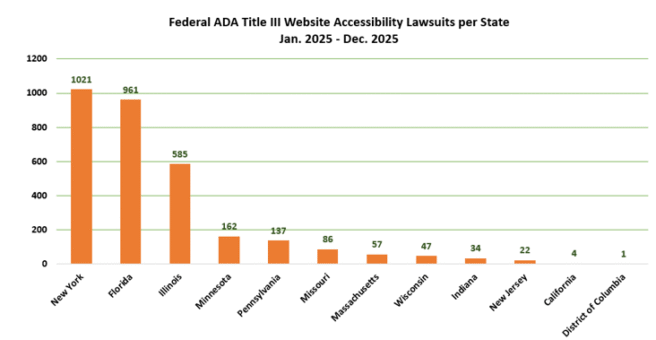 New York federal courts continued to be the busiest with 1,021 lawsuits. Florida was a close second with 961 lawsuits — almost double the 470 filings in 2024. Illinois passed Minnesota and Pennsylvania to claim the third spot with 585 lawsuits. Minnesota and Pennsylvania slid into the fourth and fifth spots with 162 and 137 lawsuits respectively. Remarkably, California’s federal courts only had four new website accessibility lawsuits last year.